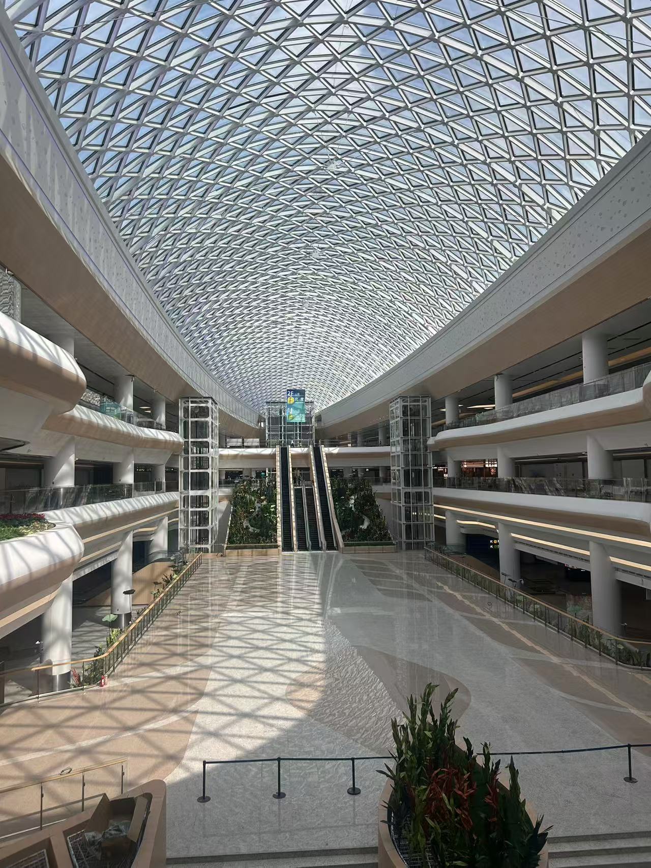 白云机场三期交通中心综合体正式运营,工控科产旗下金鼎公司打造的“木棉花开・九天银河”穹顶同步亮相。金鼎公司负责该机场三期扩建工程两大标段幕墙施工,覆盖交通中心、停车楼及旅客过夜用房全范围幕墙。交通中心中庭天窗穹顶面采用拱形网壳异形曲面结构,建成长约185米、最大跨度34米的穹顶,既是视觉焦点也是技术难点。
