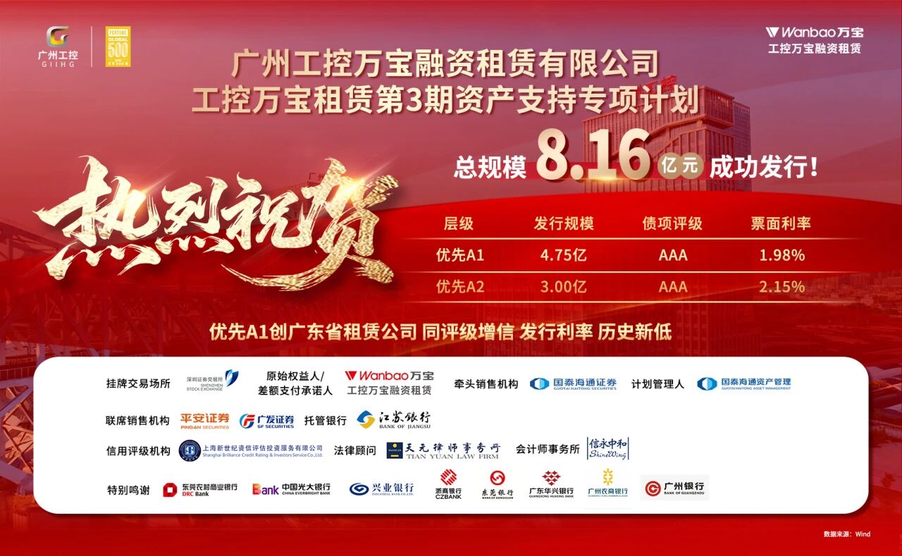 近日,广州工控集团在深化产融协同上实现新突破,旗下万宝融资租赁20亿元储架ABS项下“工控万宝租赁第3期资产支持专项计划”在深交所债券市场成功发行,发行总规模8.16亿元。与此同时,集团旗下工控资本发行2025年第二期公司债券,发行规模2亿元,以金融创新赋能产业升级,持续助力广州工控集团高质量发展。