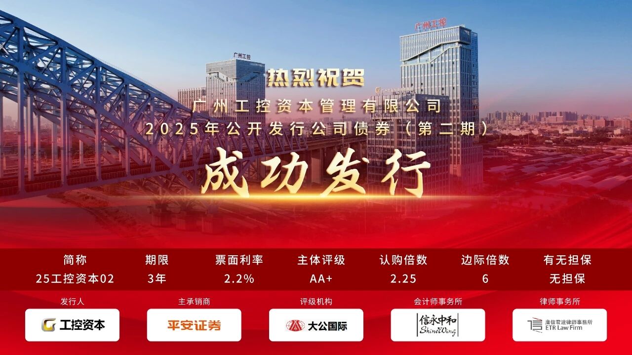 工控资本2025年第二期公司债券在资本市场成功完成发行。本期债券发行规模2亿元,期限3年,票面利率2.20%,全场认购倍数达2.25倍,边际倍数达6倍。
