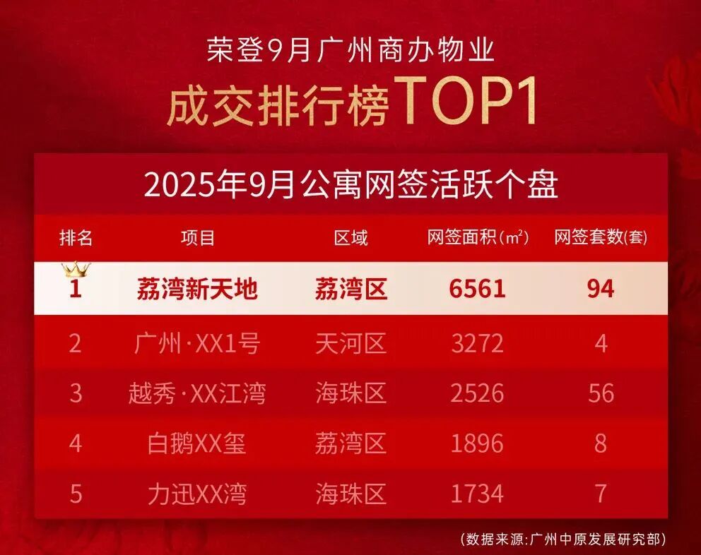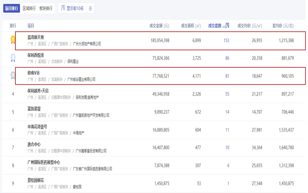 根据行业权威机构统计,岭南V谷两大在售项目2025年网签表现持续亮眼,今年上半年的月度排名中,两个项目网签排名均进入广州市排名前10、荔湾区排名前3,荔湾新天地项目荣登9月广州商办物业成交排行榜第1名。